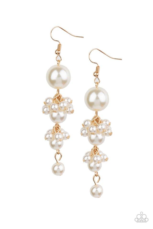 Clusters of dainty white pearls trickle along a glistening gold chain that delicately links together a bubbly strand of pearls. The classic pearls gradually decrease in size, creating a timelessly tasseled display. Earring attaches to a standard fishhook fitting.